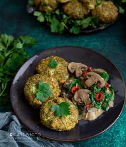Pieczone kotlety brokułowo serowe z pieczarkami na mleku kokosowym