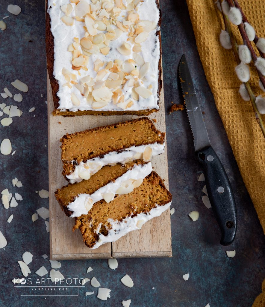 Marchewki ścieramy na tarce na drobnych oczkach. Masło roztapiamy w rondelku i studzimy. Mąkę przesiewamy i mieszamy z proszkiem do pieczenia, mąką migdałową i cynamonem. W osobnej misce ucieramy jajka z ksylitolem. Potem miksując dalej jajka na wolnych obrotach, dodajemy powoli suche składniki na zmianę z marchewką i roztopionym masłem, do całkowitego połączenia się składników. Masę przelewamy do formy i pieczemy ok. godziny w 180°. Po tym czasie wyciągamy z piekarnika i studzimy. Krem na wierzch powstał po prostu ze śmietankowego serka kanapkowego zmieszanego z jogurtem i cynamonem, smarujemy, posypujemy uprażonymi płatkami migdałowymi i już 🙂