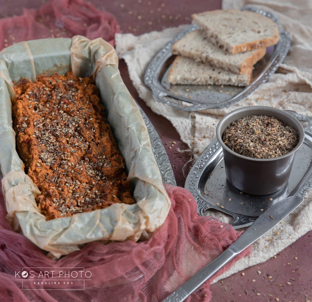 Soczewicę gotujemy w 2 szklankach wody ok.20 minut. Marchewki ścieramy na dużych oczkach tarki. Kolendrę rozcieramy w moździerzu (ziarna najlepiej wcześniej uprażyć). Na oleju smażymy pokrojoną cebulę i czosnek przez ok.10 na wolnym ogniu mieszając i pilnując, aby się nie przypaliły. Po tym czasie dodajemy przyprawy, marchewki i koncentrat pomidorowy i dusimy całość pod przykryciem kolejne 10min. Ugotowaną Soczewicę blendujemy z resztą składników. Dodajemy zatar i ewentualnie doprawiamy jeszcze solą i pieprzem. Masę przelewamy do keksówki, posypujemy jeszcze zatarem i pieczemy przez ok.50 min w 160° z termoobiegiem. Po tym czasie wyciągamy z piekarnika i zostawiamy do ostygnięcia. Potem chłodzimy w lodówce. Schłodzony da się kroić, ale spokojnie możecie go sobie rozsmarować na kanapce.