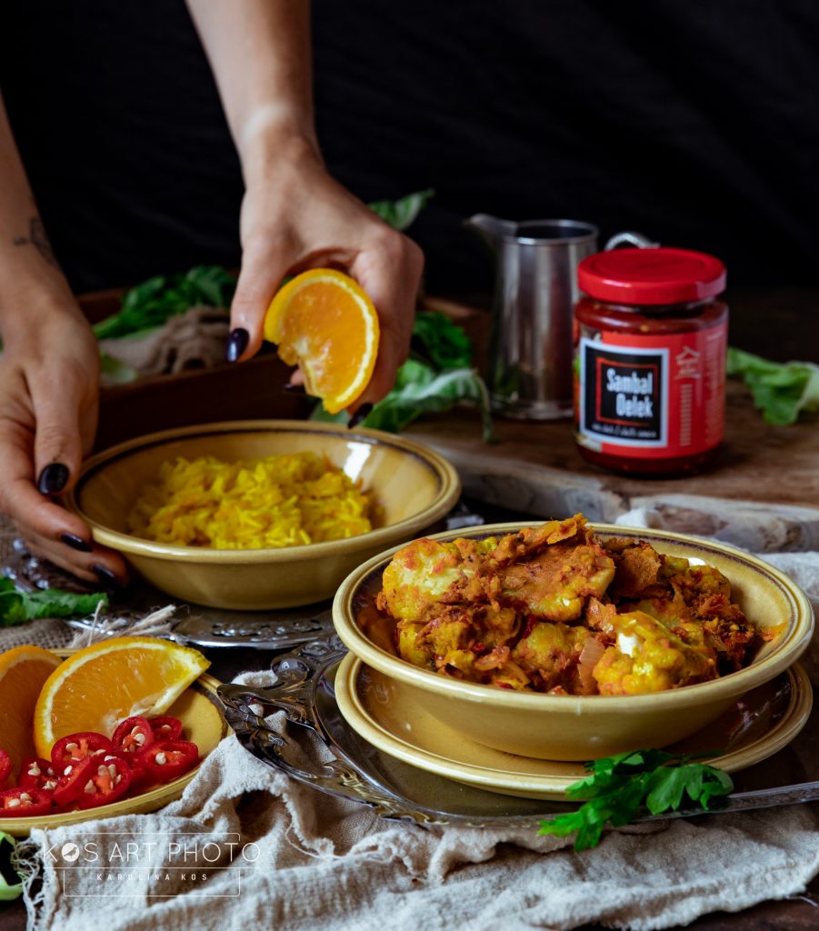 Możecie o tym nie wiedzieć, ale uwielbiam kuchnię orientalną, a szczególnie dania indyjskie, aromatyczne, o intensywnym i ciekawym smaku. Jakiś czas temu byłam restauracji na warszawskiej starówce, gdzie na przystawkę serwowano panierowany i smażony kalafior gobi, podawany z kawałkami pomarańczy. Smak był niezwykły, nie jadłam wcześniej takiego dania i przyznam, że wyszłam nim oczarowana. Postanowiłam stworzyć coś podobnego w domu. Wzorując się na tym daniu, oraz innych potrawach z kuchni indyjskiej wyczarowałam coś niezwykłego, w sam raz dla fanów orientalnych smaków. Mamy tu smażony kalafior w cieście, duszony w pikantny sosie, a do tego ryż z pomarańczą, szafranem i kardamonem. Ciekawi? Zapraszam na przepis!
