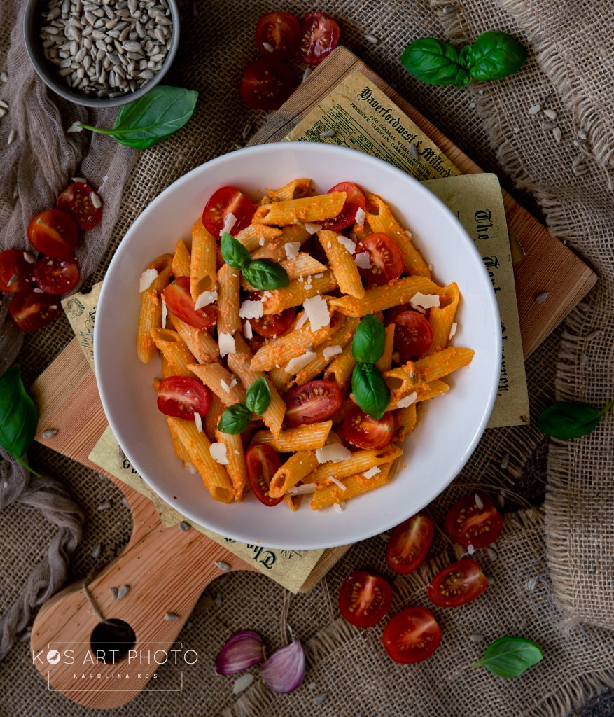 Papryki kroimy na pół, usuwamy gniazda nasienne i pieczemy w piekarniku nagrzanym do 180° przez 30 minut (możecie to zrobić w naczyniu żaroodpornym lub po prostu na papierze do pieczenia). Po tym czasie wyciągamy papryki i zostawiamy do przestygnięcia na jakieś 10-15 minut. Następnie ściągamy z nich skórkę (nie musi być bardzo dokładnie) i umieszczamy w misie blendera. Dodajemy pestki słonecznika, ser, oliwę, posiekany czosnek, sok z cytryny i przyprawy i blendujemy całość na gładką pastę. Makaron gotujemy według instrukcji na opakowaniu. Ugotowany makaron mieszamy z pesto, dodajemy przekrojone pomidorki koktajlowe i posypujemy płatkami parmezanu.