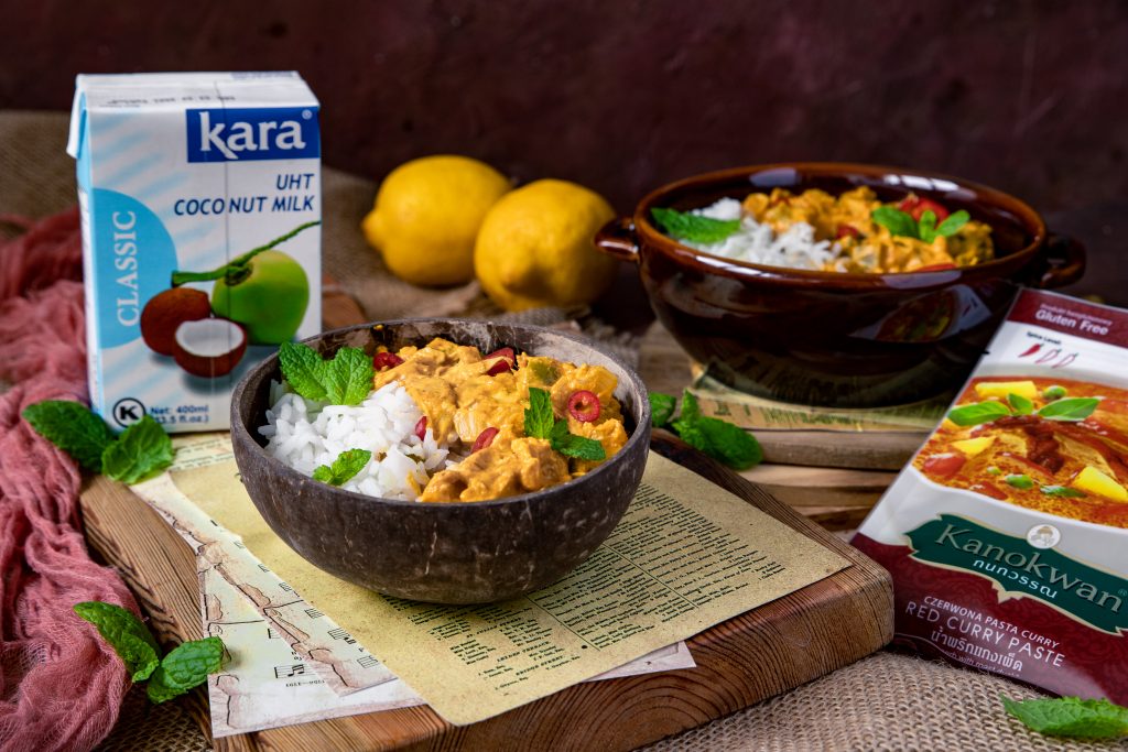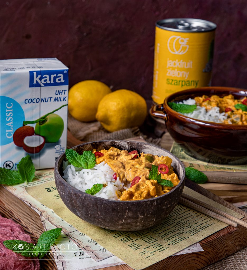 Mleczko kokosowe Kara, pastę curry Kanokwan i szarpanego jackfruita możecie nabyć na stronie DeCare.pl