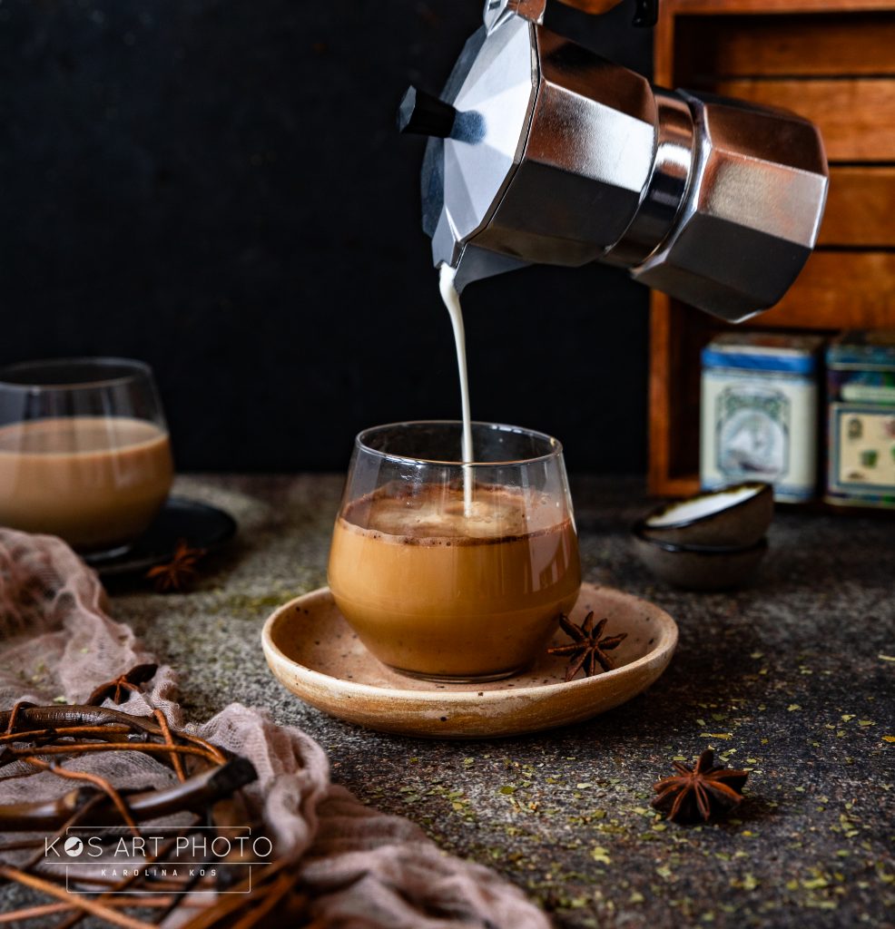 W rondelku zagotowujemy wodę. Do wrzątku wrzucamy wszystkie przyprawy i gotujemy jakieś 5 minut. Po tym czasie wrzucamy 2 torebki herbaty i słodzimy. Dodajemy kawę i gotujemy jeszcze przez jakieś 2-3 minuty. W między czasie podgrzewamy mleko, a następnie je spieniamy. Napar wywar z kawy i herbaty przelewamy przez sitko do szklanki lub kubka i zalewamy ciepłym, spienionym mlekiem.