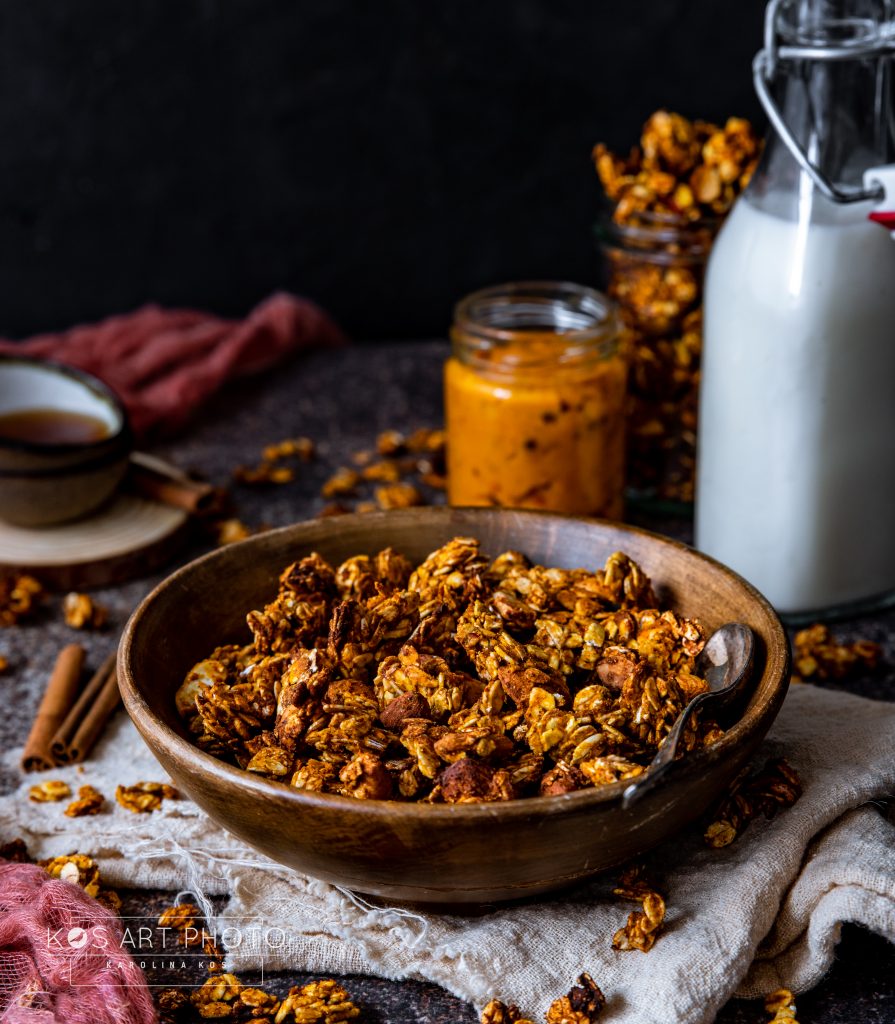 Zapraszam na dyniową granolę! Idealna na jesień, słodka, chrupiąca i pełna korzennych przypraw! Dodatek kardamonu, imbiru i cynamonu nadaje cudowny smak. Jeśli robicie sobie w domu, to koniecznie musicie wypróbować tej!To rewelacyjny dodatek do deserów, jogurtów, owsianki itp, ale jest tak pyszna, że sama w sobie jest ekstra przekąską! Przyznam, że ja chrupię ją na sucho, prosto ze słoika, haha!