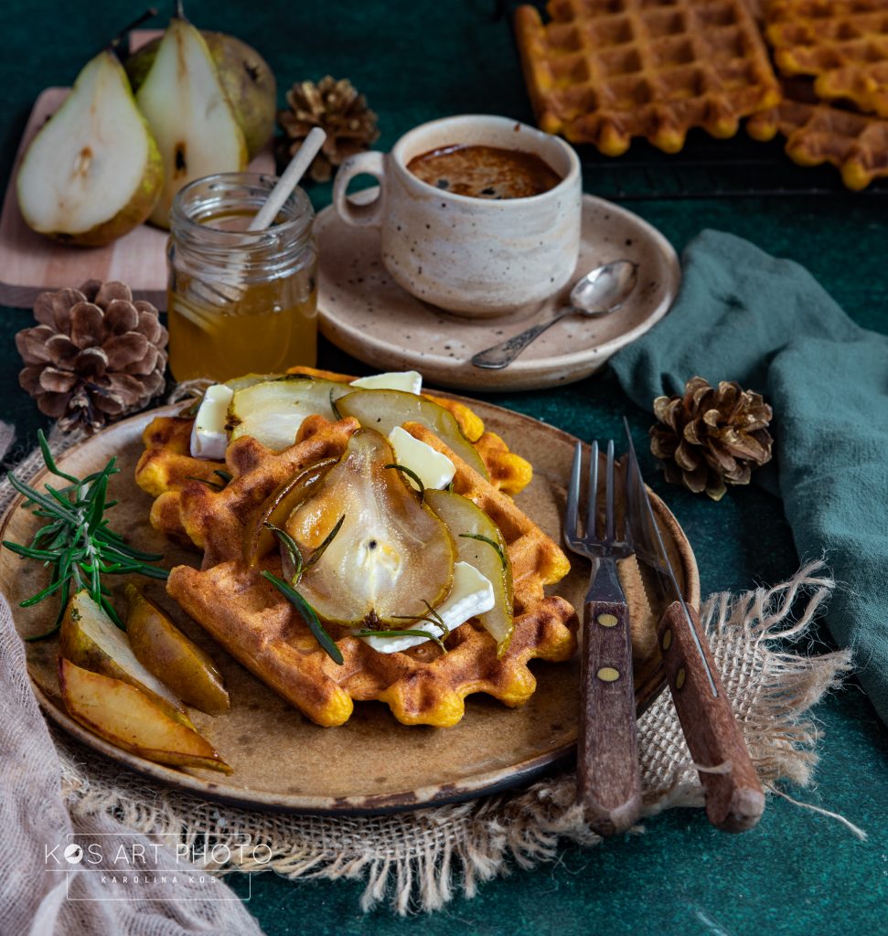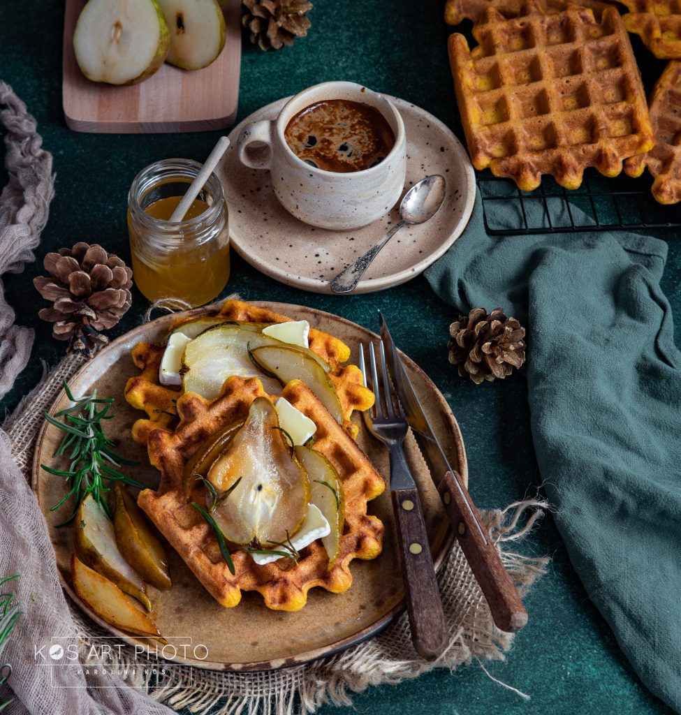 Przychodzę dziś do was z absolutnie pysznym, jesiennym śniadaniem. Gofry wolicie jeść na słodko czy na wytrawnie? A może lubicie tak i tak? To mam dla was coś idealnego! Chrupiące dyniowe gofry, z camembertem, karmelizowaną gruszką i rozmarynem! Te smaki idealnie się uzupełniają! Do tego jeszcze kawka i mamy mistrzowskie śniadanie!