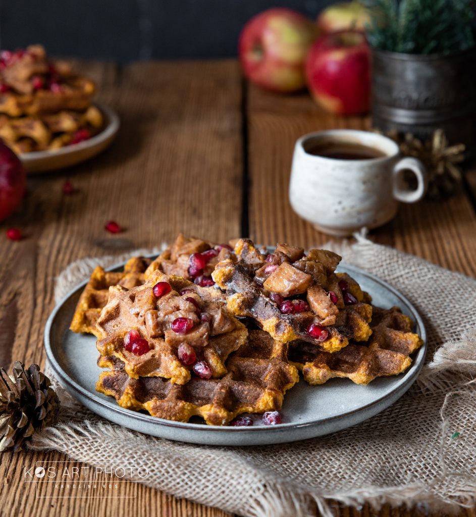 Witam się z wami słodkim śniadaniem. Takie pyszności możecie zeserwować kochanej osobie nie tylko od święta! Albo zjeść samemu na wspaniały początek dnia! Gofry z batata wychodzą mniej chrupiące niż klasyczne, mimo to warte spróbowania 🙂 Do tego pachnące cynamonem jabłka i sos karmelowy z daktyli… Czyż to nie brzmi wspaniale?>