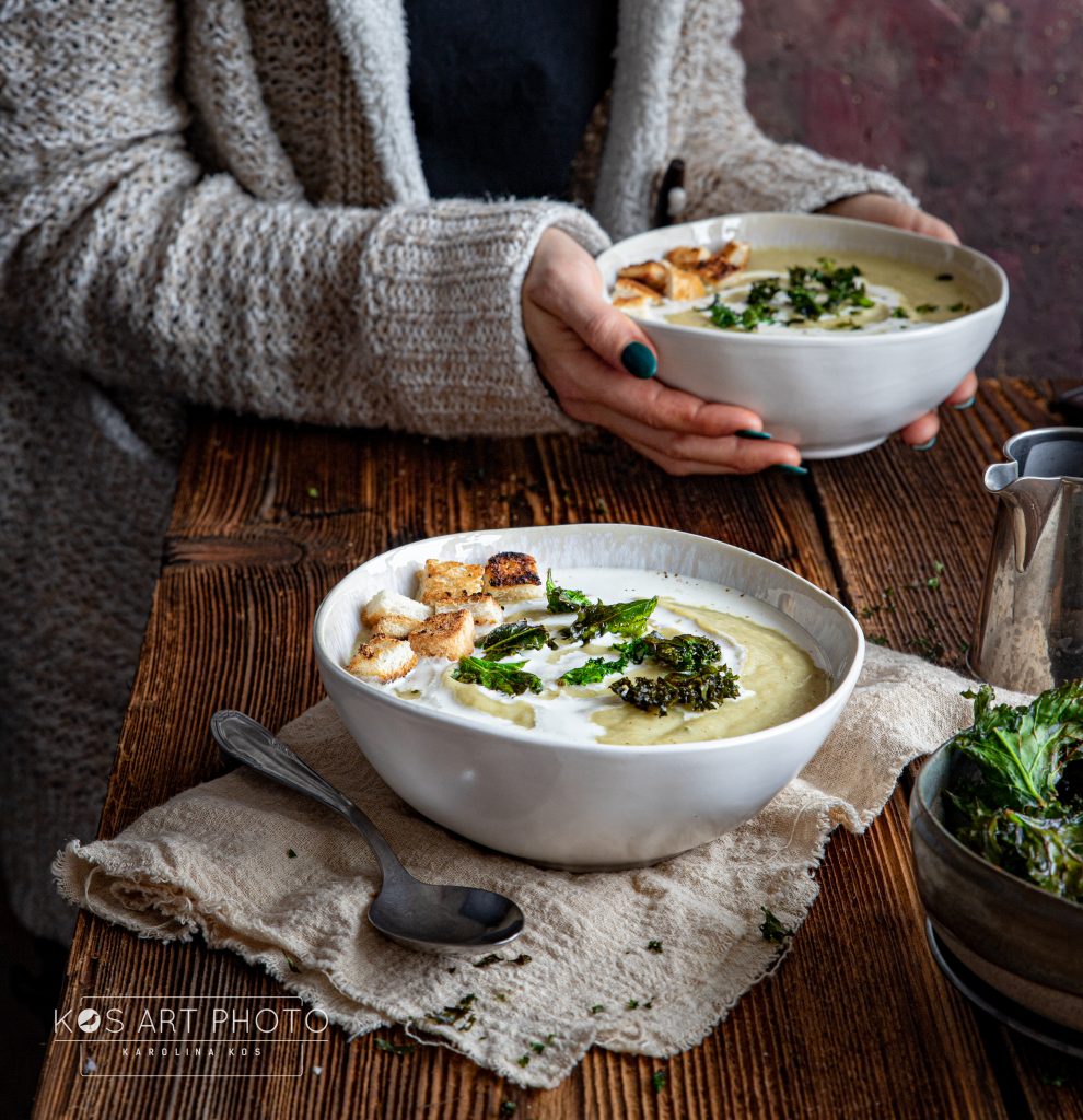 Dziś przychodzę z pyszną, kremową zupą z sezonowych warzyw. Przyznam, że uwielbiam zapach selera, już sam w sobie pachnie dla mnie esencją rosołu, (podobnie lubczyk), jednak dotychczas stanowił dla mnie jedynie dodatek smakowy do bulionu, ewentualnie w surówce. A gdyby tak podać go w roli głównej? Mam plan w tym miesiącu odczarować trochę to warzywo i wypróbować w różnych daniach. Na początek zapraszam na krem z selera i pora, podany z chipsami z jarmużu i grzankami.