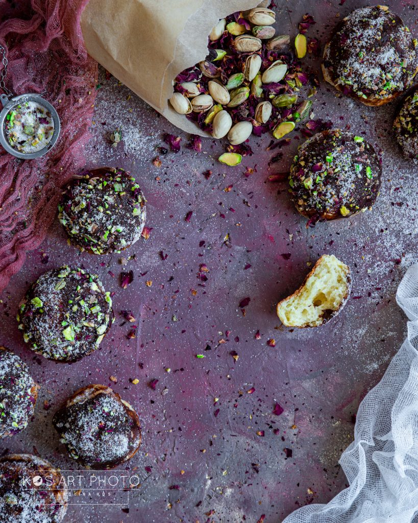 Przygotowałam mini pączki serowe z piekarnika. Najpierw posypałam je cukrem pudrem zmieszanym z pokruszonymi pistacjami I suszonymi płatkami róży, ale nie byłam zadowolona z efektu, więc zrobiłam polewę czekoladową, zanurzyłam w niej pączusie i dopiero obtoczyłam. Dzięki temu i prezentują się lepiej i lepiej smakują!