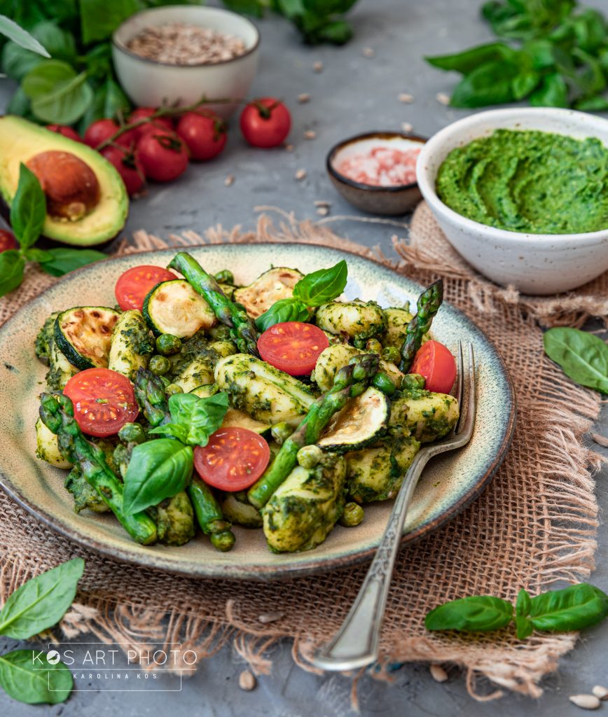 Dziś przygotowałam gnocchi z domowym pesto i warzywami. Poniżej podam przepis na pesto, warzywa możecie dowolnie modyfikować (ja użyłam szparagów, cukinii i zielonego groszku), a gnocchi zamienić na ulubiony makaron.
