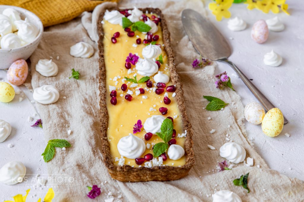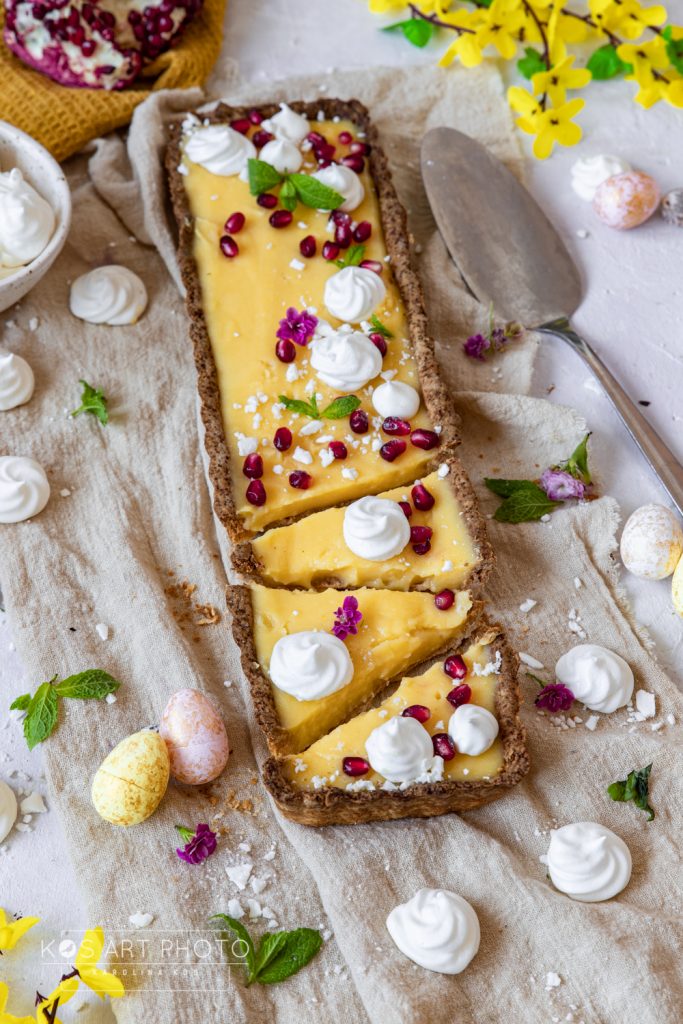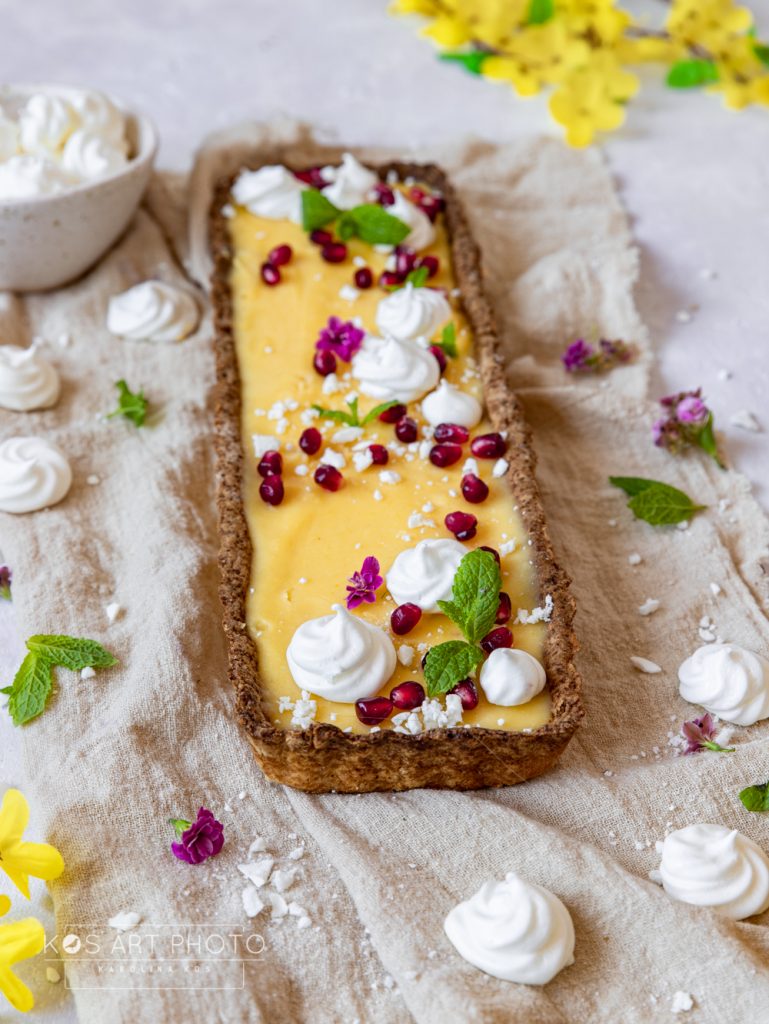 Przygotowujemy krem. W rondelku podgrzewamy olej kokosowy z erytrytolem i skórą cytryny, aż erytrytol całkowicie się rozpuści. Dolewamy sok z cytryny i podgrzewamy chwilę po czym dodajemy roztrzepane jajka oraz żółtka i energicznie mieszamy. Gotujemy aż krem zgęstnieje, po czym przelewamy go przez sito. Do gorącego kremu dodajemy podzieloną na kostki białą czekoladę i mieszamy, aż się całkowicie rozpuści. Gotowy krem wykładamy na kruchy spód, a po przestudzeniu wstawiamy do lodówki, aby zgęstniał (ok.2h). Przed podaniem dekorujemy pestkami granatu, mini bezami i listkami mięty.