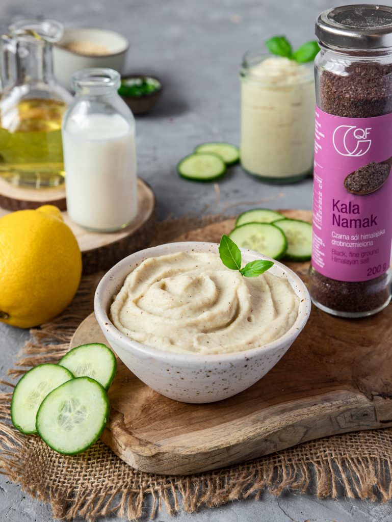 Kalafiora dzielimy na różyczki i gotujemy do miękkości we wrzątku lub na parze. Zostawiamy do wystudzenia. Następnie blendujemy różyczki z pozostałymi składnikami i przyprawami (poza olejem) na gładką konsystencję. Dzięki wykorzystaniu soli Kala Namak uzyskamy jajeczny posmak. Na koniec dodajemy olej i ponownie miksujemy. Ewentualnie doprawiamy, jednak warto pamiętać, że w lodówce smaki się przegryzą.