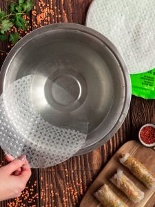 Przygotowujemy miskę z wodą i papier ryżowy. Bierzemy po jednym arkuszu i maczamy chwilkę w wodzie, po czym kładziemy na przygotowanej wcześniej na blacie czystej ścierce. Na środek nakładamy łyżkę farszu i zawijamy sajgonki: najpierw przykrywamy jedną częścią farsz, potem zawijamy boki, a na koniec rolujemy całość). Powtarzamy z pozostałymi arkuszami.