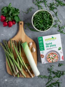 Ciasto na pizzę wkładamy pomiędzy dwa kawałki papieru do pieczenia i rozwałkowujemy na cienki, okrągły placek. Na pizzy rozprowadzamy beszamel, a na nim usmażonego pora. Ze szparagów odrywamy twarde końce i dzielimy je na pół, a rzodkiewki i cukinię kroimy w plastry. Układamy warzywa na pizzy. Ricottę nakładamy łyżeczką w kilku miejscach. Pizzę wstawiamy do piekarnika na 10 min. Upieczoną podajemy ze świeżą rukolą. Smacznego!