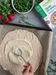 Rozgrzewamy piekarnik do 250°. Spód do pizzy przygotowujemy zgodnie z instrukcją na opakowaniu.