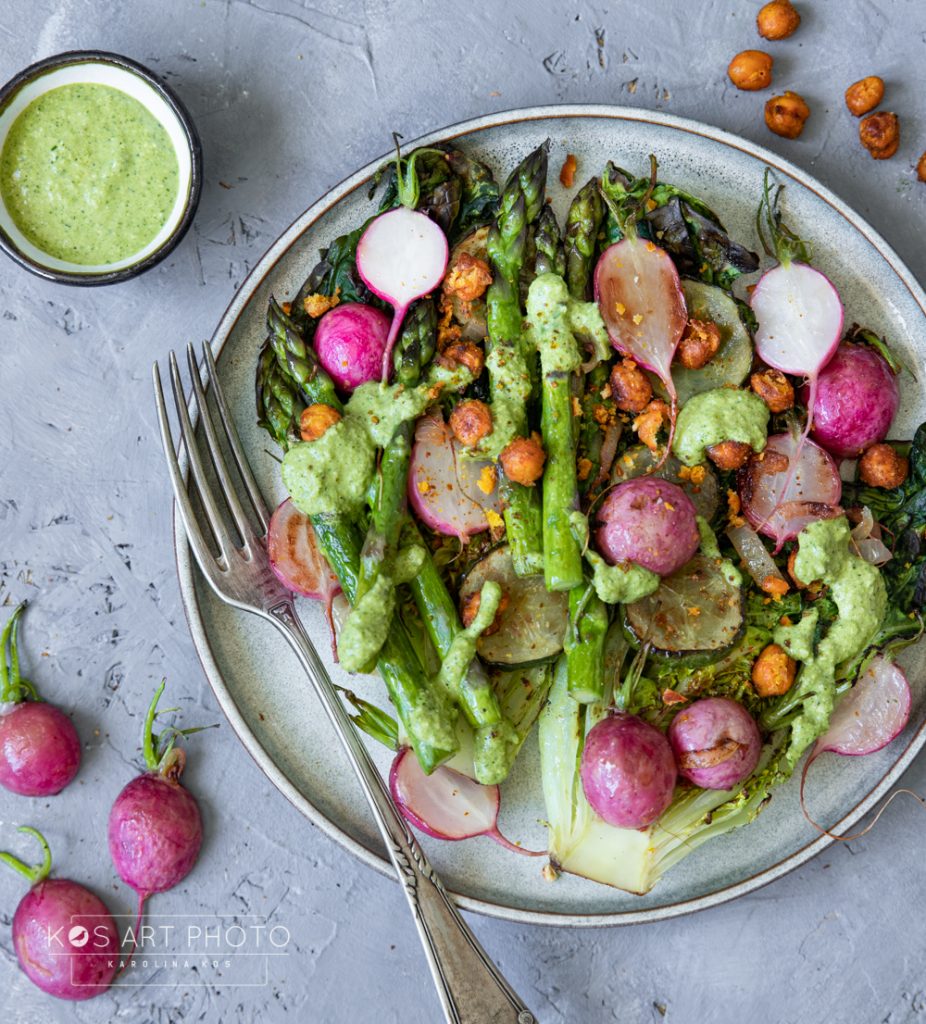 To danie to prawdziwa wiosenna eksplozja smaków! Zaskakujące w swej prostocie i nieziemskim smaku. Warzywa, które najczęściej jadamy na surowo, w tym wydaniu nabierają wyjątkowego charakteru! Grillowana, chrupiąca sałata, do tego smażone warzywa: szparagi, rzodkiewki i ogórki i dodatek chrupiącej, pieczonej ciecierzycy! O rzodkiewkach na ciepło już wam pisałam, jednak żadne słowa nie oddadzą tego, jak ona smakuje. Musicie sami spróbować. A to wszystko polane przepysznym domowym pesto z liści, które najczęściej lądują w koszu: z liści rzodkiewek. Zapraszam na wyjątkową ucztę!