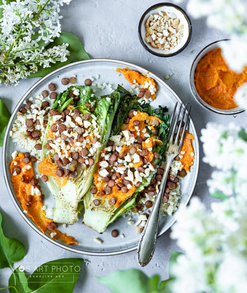 Marchewki obieramy ze skórki, kroimy na mniejsze kawałki I gotujemy w niedużej ilości wody, aż będą miękkie. Dodajemy pokrojony w kostkę rabarbar i gotujemy kolejne 10 min. Odcedzamy, blendujemy na gładkie puree, dodajemy masło oraz miód (lub zamienniki) i mieszamy. Sałatę rzymską kroimy na pół, nacieramy oliwą, posypujemy solą i pieprzem, a następnie grillujemy na rozgrzanej patelni, po ok 2-3 minuty na każdą stronę, aż się zarumieni. Na talerze rozkładamy ugrillowaną sałatę, kaszę oraz soczewicę, podajemy z puree z rabarbaru i marchewek, posypane pokruszonymi orzechami. Oczywiście porcje kaszy i soczewicy można regulować pod siebie.