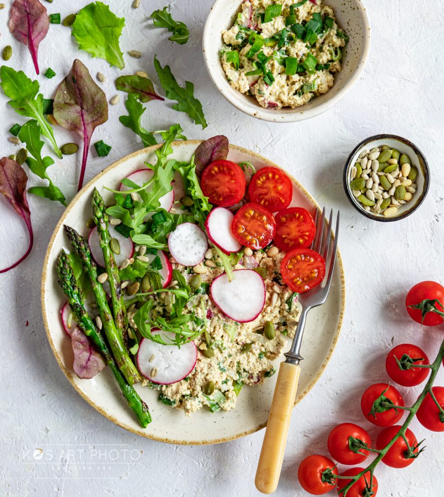 Tofu porządnie odciskamy z nadmiaru wody i kruszymy do miski. Dodajemy śmietankę kokosową, sok z cytryny, sos sojowy i doprawiamy pieprzem. Kilka rzodkiewek i szczypiorek kroimy drobno i łączymy z twarożkiem. Mieszamy dokładnie. Odrywamy twarde końce szparagów i je grillujemy. Twarożek podajemy z mixem sałat, grillowanymi szparagami, rzodkiewką i pomidorkami, na koniec posypujemy prażonymi pestkami.