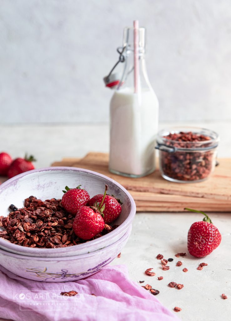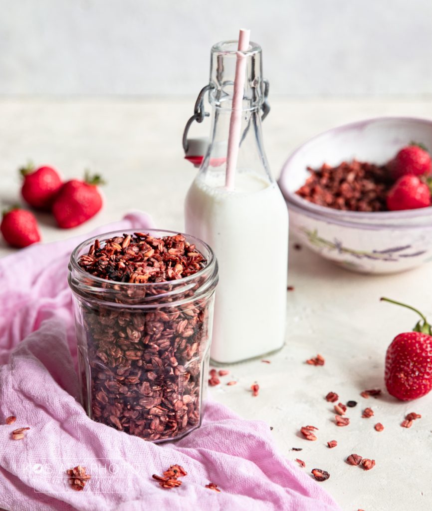 Truskawki… wszędzie truskawki! Kocham ten sezon, truskawki lądują u mnie wszędzie ostatnio! Tym razem mam dla was przepis na domową granolę z ich udziałem. Przygotowanie w domu granoli jest niezwykle proste i niedrogie, a możemy ją dowolnie modyfikować, według własnych upodobań. Ta sezonowa odsłona wyszła pysznie! Ciężko się powstrzymać by nie wyjeść całej prosto ze słoika.