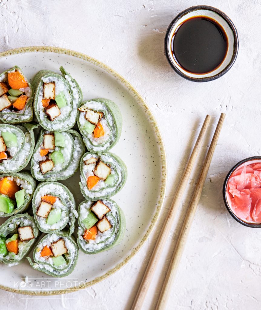 Na każdym naleśniku rozprowadzamy porcję ryżu. Smarujemy serkiem Philapelphia, układamy warzywa oraz tofu. Rolujemy, kroimy i gotowe! Sushi podajemy z sosem sojowym, wasabi i imbirem marynowanym.
