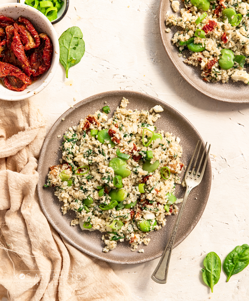 Znacie ryż z kalafiora? To właśnie on, rozdrobiony i na pół surowo, jest bazą w tym daniu. Zapraszam na sałatkę na ciepło z kalafiorowym „ryżem”, bobem, dzięki któremu danie jest bardziej syte, oraz suszonymi pomidorami.