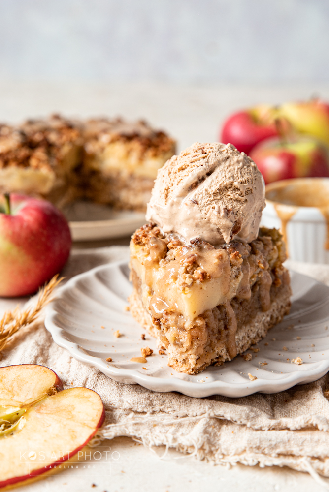 Szarlotkę przygotowałam na pełnoziarnistym, owsianym spodzie, wypełnioną darami jesieni, pachnącą cynamonem… do tego jeszcze budyń, kruszonka i polewa w postaci karmelu z daktyli… wyszło przepysznie!