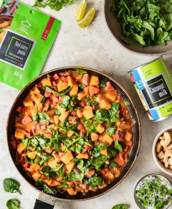 Cebulę i czosnek obieramy i siekamy, a następnie podsmażamy w głębokiej patelni na rozgrzanym oleju. Paprykę i dynię kroimy w niedużą kostkę i dodajemy do cebuli. Smażymy parę minut, po czym dodajemy pastę curry i zalewamy całość puszką mleka kokosowego. Mieszamy dokładnie, aby rozprowadzić pastę, a następnie przykrywamy i dusimy ok 20 minut. Po tym czasie zdejmujemy przykrywkę i dodajemy posiekane liście szpinaku. Dusimy jeszcze chwilę, do czasu aż dynia będzie miękka. W czasie duszenia warzyw, gotujemy ryż według instrukcji na opakowaniu. Po ugotowaniu odcedzamy, a następnie łączymy z sokiem wyciśniętym z jednej limonki i posiekaną świeżą kolendrą.
