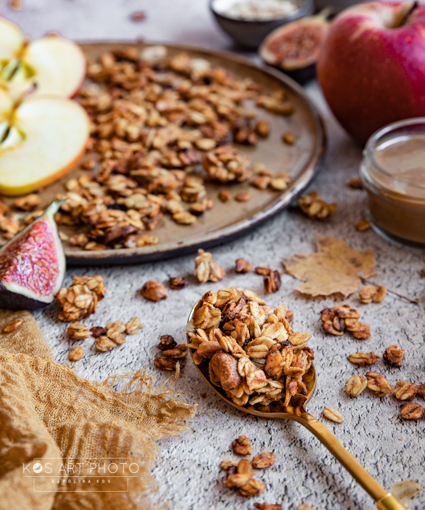 Tym razem przygotowałam ją w jesiennej odsłonie: z musem jabłkowym pachnącym cynamonem i „karmelem” daktylowym, który nadaje słodyczy. Całość jest chrupiąca i tak pyszna, że nawet moja wybredna córka wyjada ją wprost ze słoika.