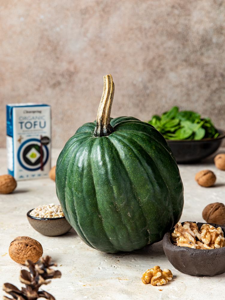 Odcinamy górną część dyni i za pomocą łyżki wyjmujemy miąższ z pestkami. Tak przygotowaną dynię wstawiamy na 40 minut do nagrzanego do 180° piekarnika. W międzyczasie gotujemy kaszę według instrukcji na opakowaniu. Na małej patelni rozgrzewamy olej i wrzucamy posiekany czosnek. Smażymy do zarumienienia i dodajemy liście szpinaku. Podgrzewamy aż zmięknie i znaczy zmniejszy objętość. Następnie dokładamy tofu, ugotowaną kaszę i suszone pomidory. Polewamy 1 łyżka sosu sojowego i doprawiamy do smaku. Na koniec dodajemy połamane na mniejsze kawałki orzechy włoskie. Wyjmujemy dynię i nadziewamy ją naszym farszem. Wstawiamy do piekarnika na jeszcze 10 minut.
