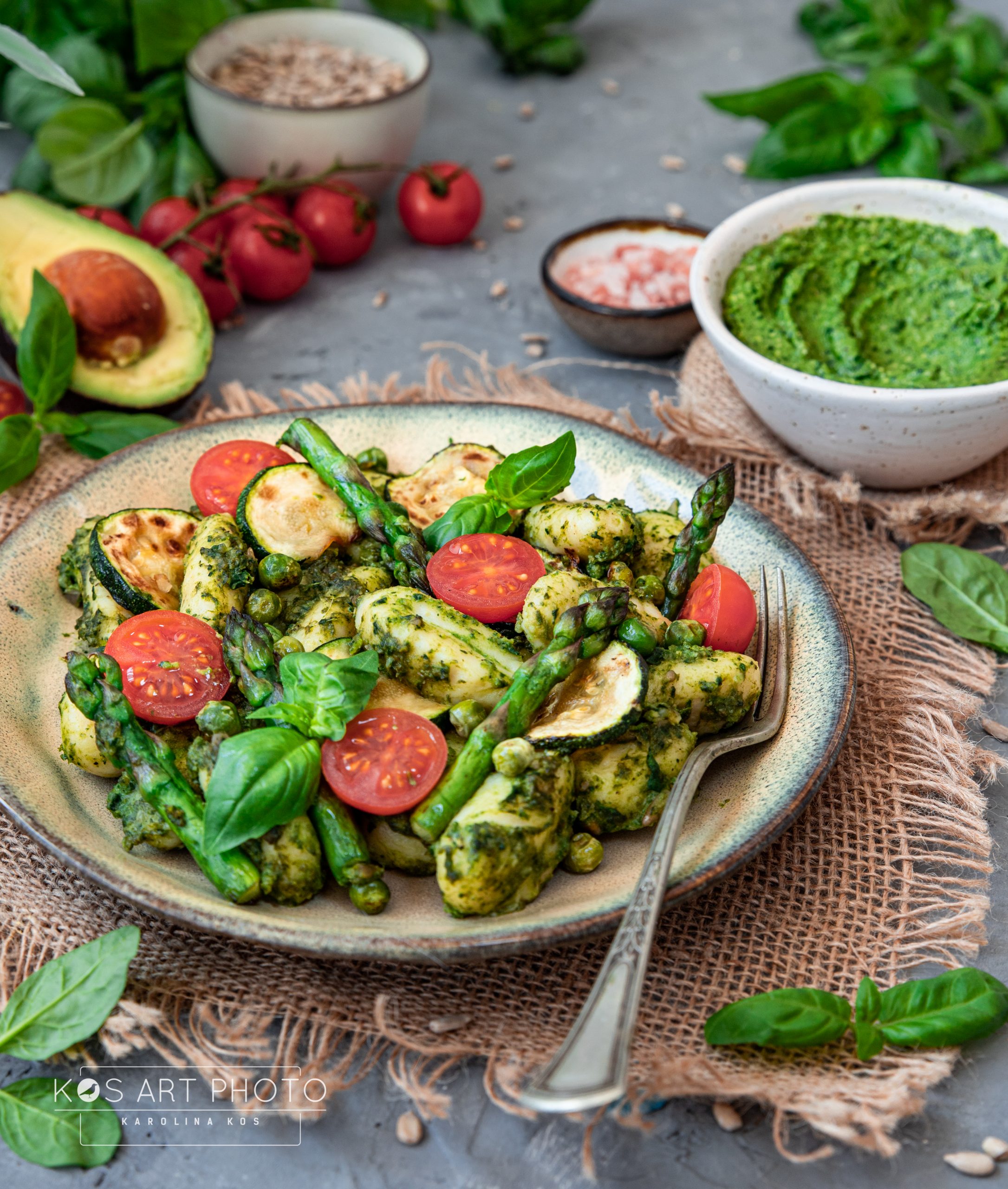 Piękna pogoda z rana nastroiła mnie do zrobienia iście wiosennego dania! Jest to wariacja dla klasycznego makaronu z pesto, które uwielbia chyba każdy, zarówno za