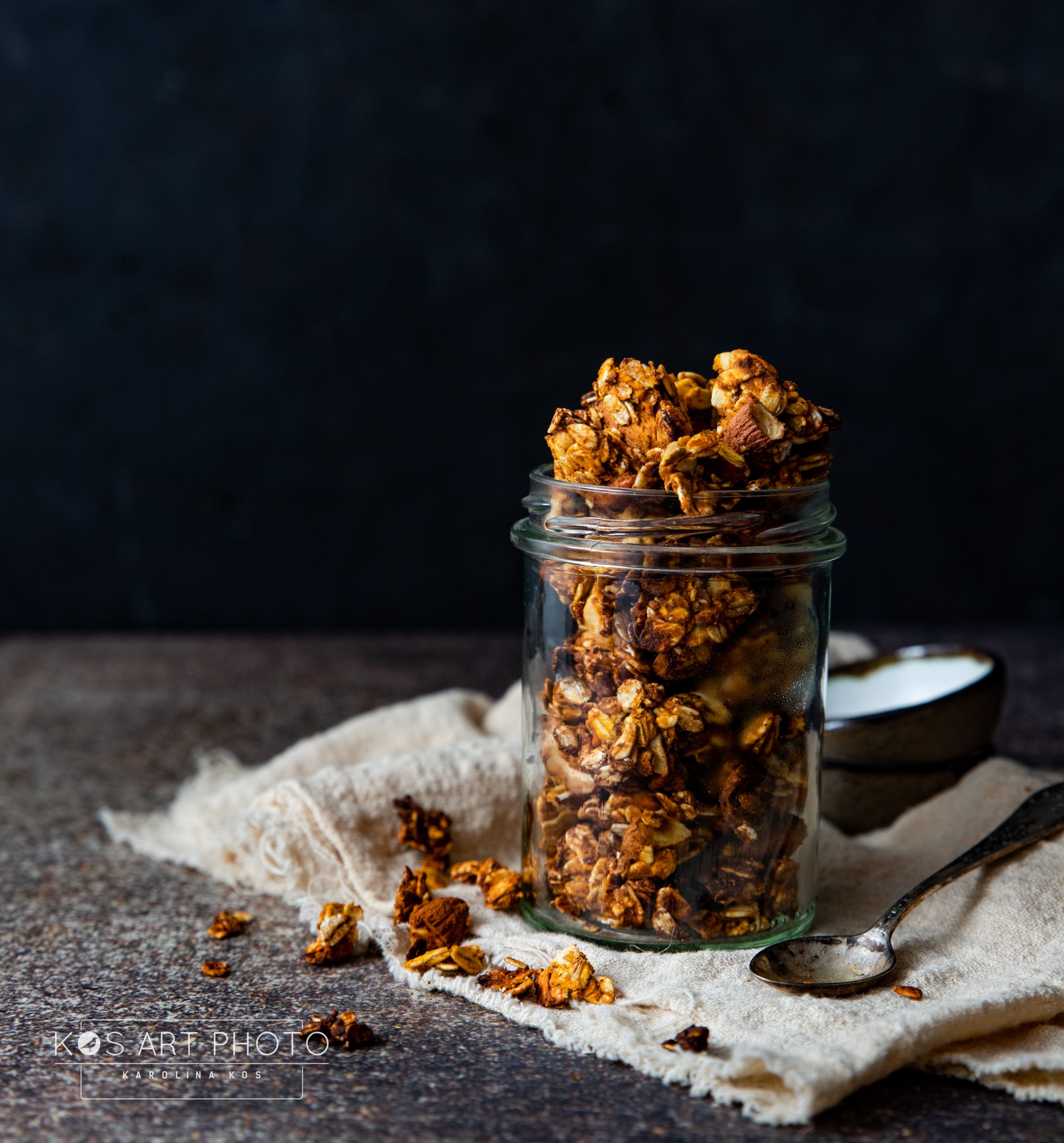Zapraszam na dyniową granolę! Idealna na jesień, słodka, chrupiąca i pełna korzennych przypraw! Dodatek kardamonu, imbiru i cynamonu nadaje cudowny smak. Jeśli robicie sobie w